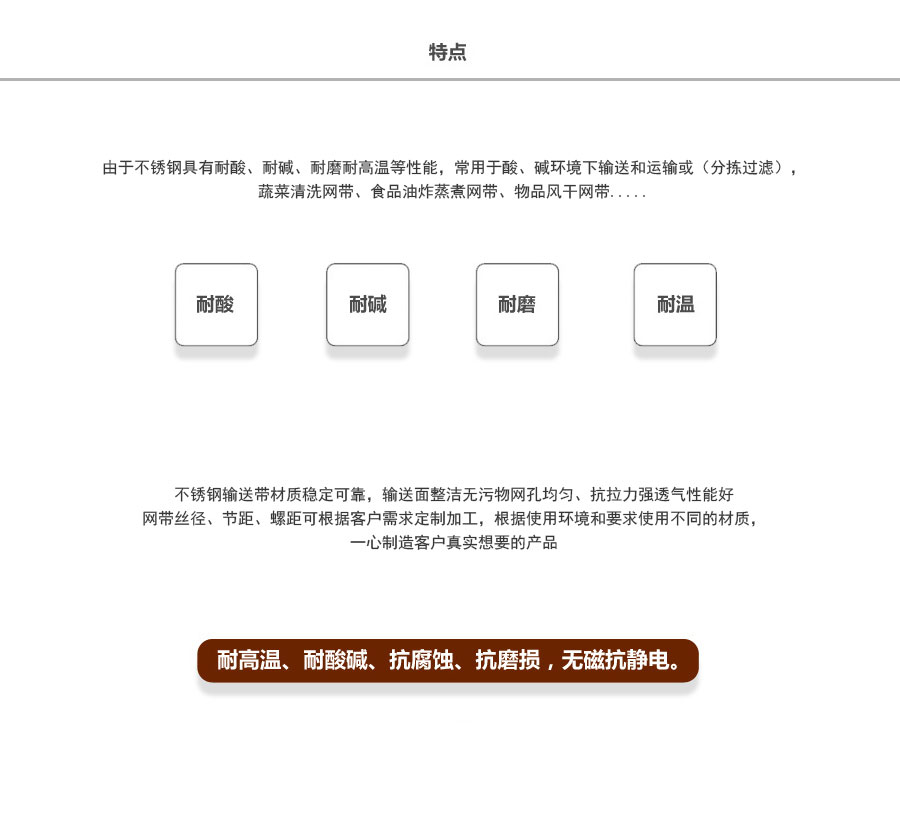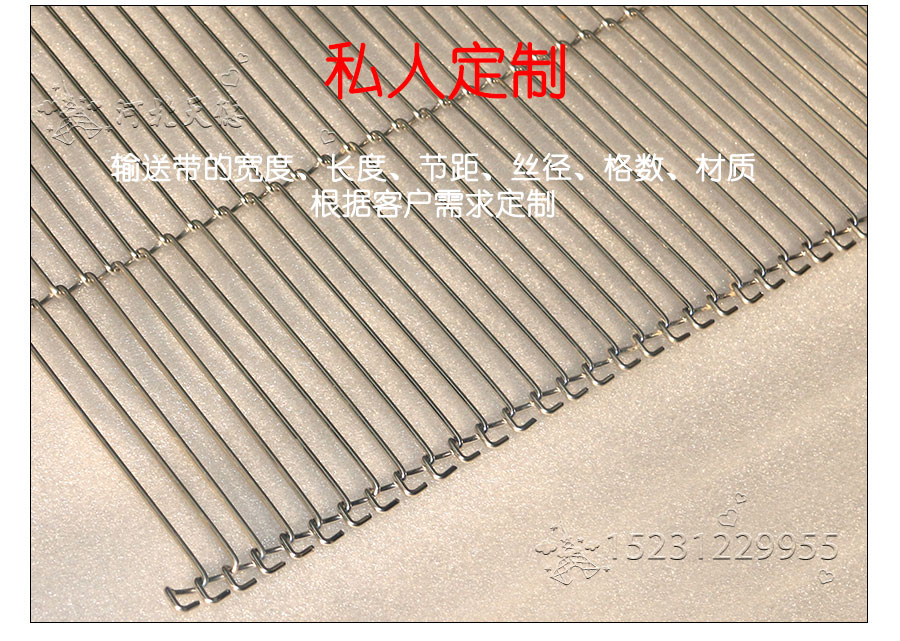不銹鋼網帶屬于非標準件,我們將根據你提供的規格長寬,材質,不銹鋼絲線徑,編制結構尺寸,支軸直徑,支軸間距,鏈條型號等數據制作.