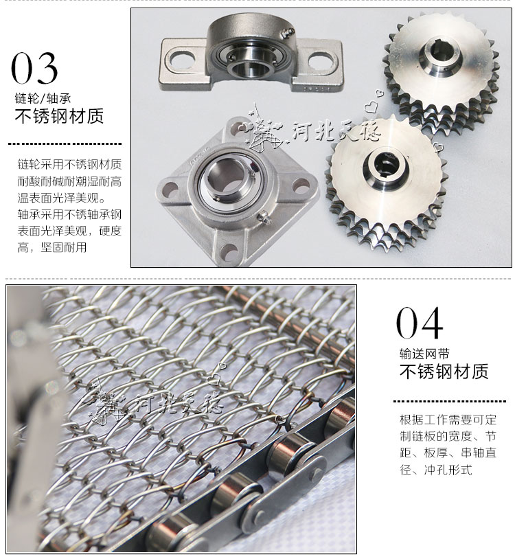 采用不銹鋼網(wǎng)帶作為載體,適用于各種食品行業(yè)的烘干、去濕、冷凍等、熱處理等;不銹鋼制成,具有耐高溫、便于清洗等特點(diǎn)。