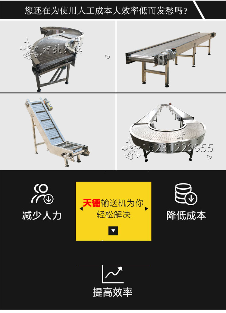 1.鏈板輸送機的輸送面平坦光滑,摩擦力小,物料在輸送線之間的過渡平穩,可輸送各類玻璃瓶、PET瓶、易拉罐等物料,也可輸送各類箱包。